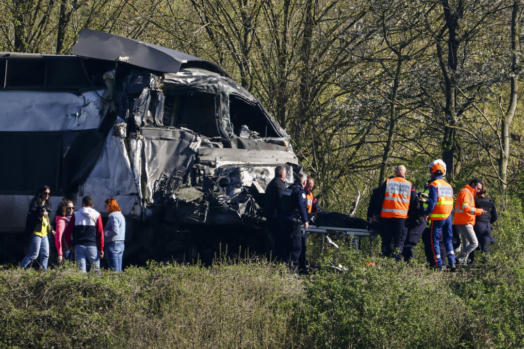 Firefighters and police officers transport a person from the wreckage of a TGV train after its collision at a level crossing with a truck between Bethune and Lens, in the Pas-de-Calais region, France,…